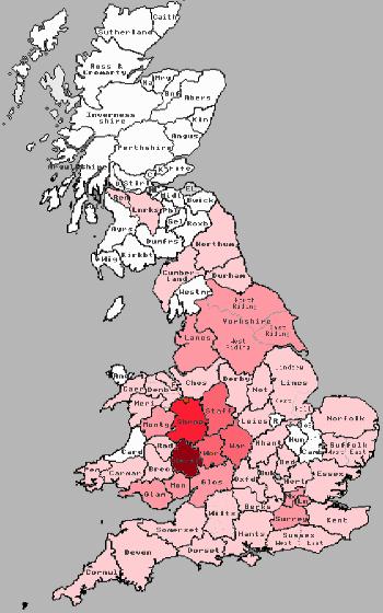 A glance at modern telephone directories will tell you that the Preece name is very prevalent in the general western Midlands area. It would also tell you that there are now arguably more Preece families in Wales than 100 years ago, and that there are Preece families in almost every county in England and Wales, and a far greater number in Scotland in 1881. As shown elsewhere, it is widely thought that the Preece name originated in Wales, and spread into the border counties of England, where it retains a large presence today. However, the picture in 1881 was very different. At that time, Herefordshire was home to almost a third of all the Preeces living, With Shropshire weighing in with 15% itself, resulting in almost half of the total in just two counties. Further large concentrations were found in Gloucestershire, Worcestershire, Staffordshire, Warwickshire, and the two Welsh counties of Monmouthshire and Glamorgan. In addition quite a number had moved to London (Middlesex and Surrey) and Cheshire, but outside these counties the numbers were very sparse, reflecting the fact that traveling many miles for work was an exception rather than a rule as far as Preece families were concerned. By 1999, the picture had changed, although the majority