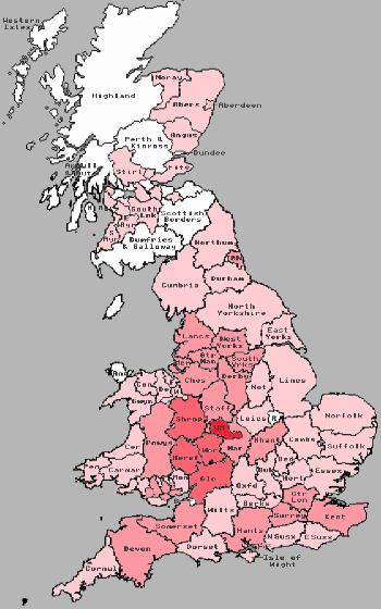 Midlands counties, with most counties having a number of
